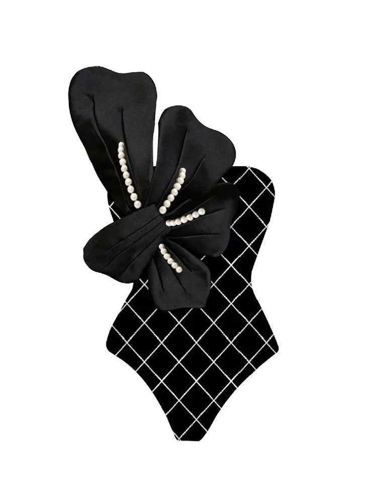Elegant and eye-catching, this black printed swimsuit set features delicate pearl flower embellishments that add a touch of luxury and femininity. A perfect fusion of romance and modern swimwear style.